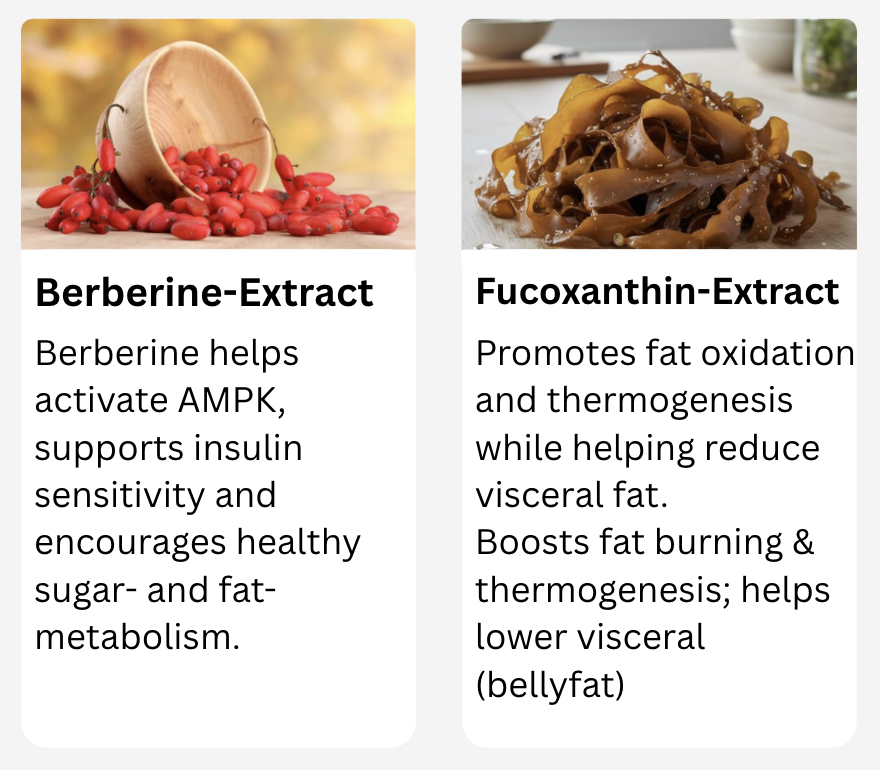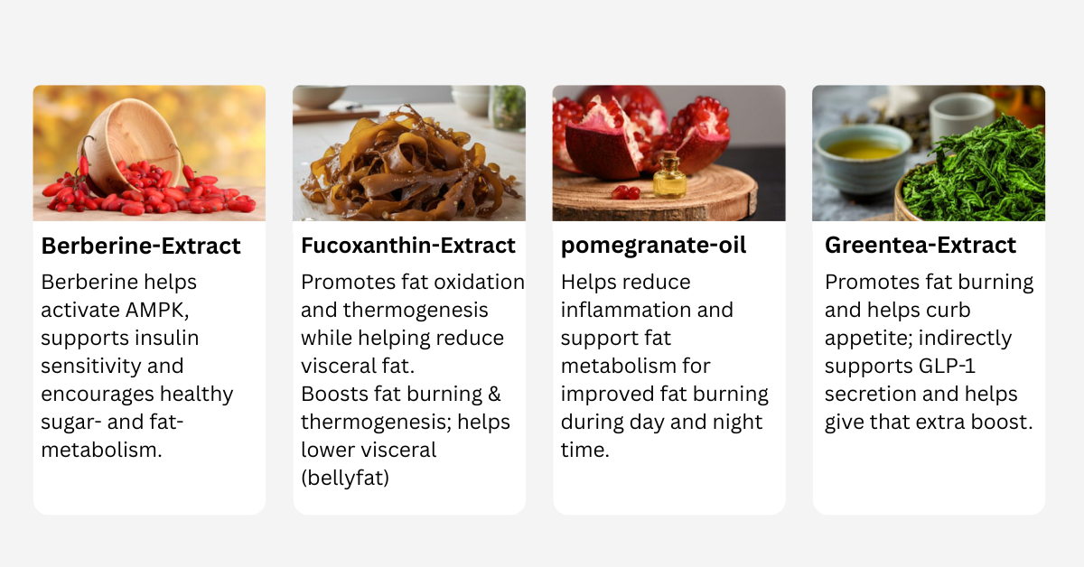 The plant-based actives are formulated to support your body’s own GLP-1 activity. Working together, they encourage fat-burning and gently nudge metabolism into a more active state—without overstressing the system